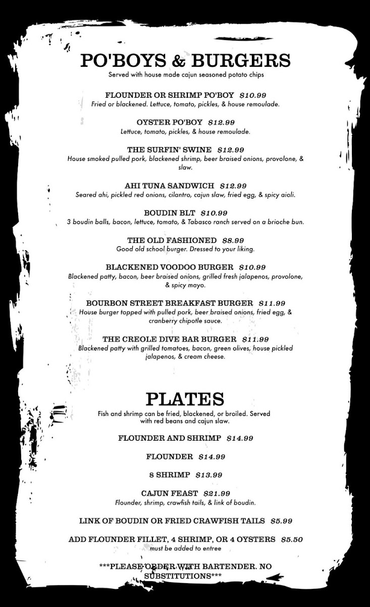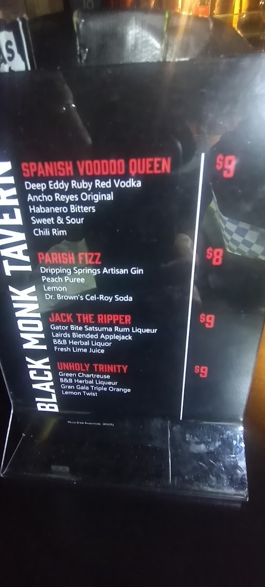 The menu features standout drinks like the Negroni Campari and Swamp Mule, each priced at an inviting $8. Alongside these cocktails, the Black Monk Specialties such as the Spanish Voodoo Queen and Unholy Trinity showcase creative flavor combinations at budget-friendly prices. Guest favorites extend beyond drinks—diners rave about the fried mushrooms and stunning fish tacos, perfect for a lively Taco Tuesday.